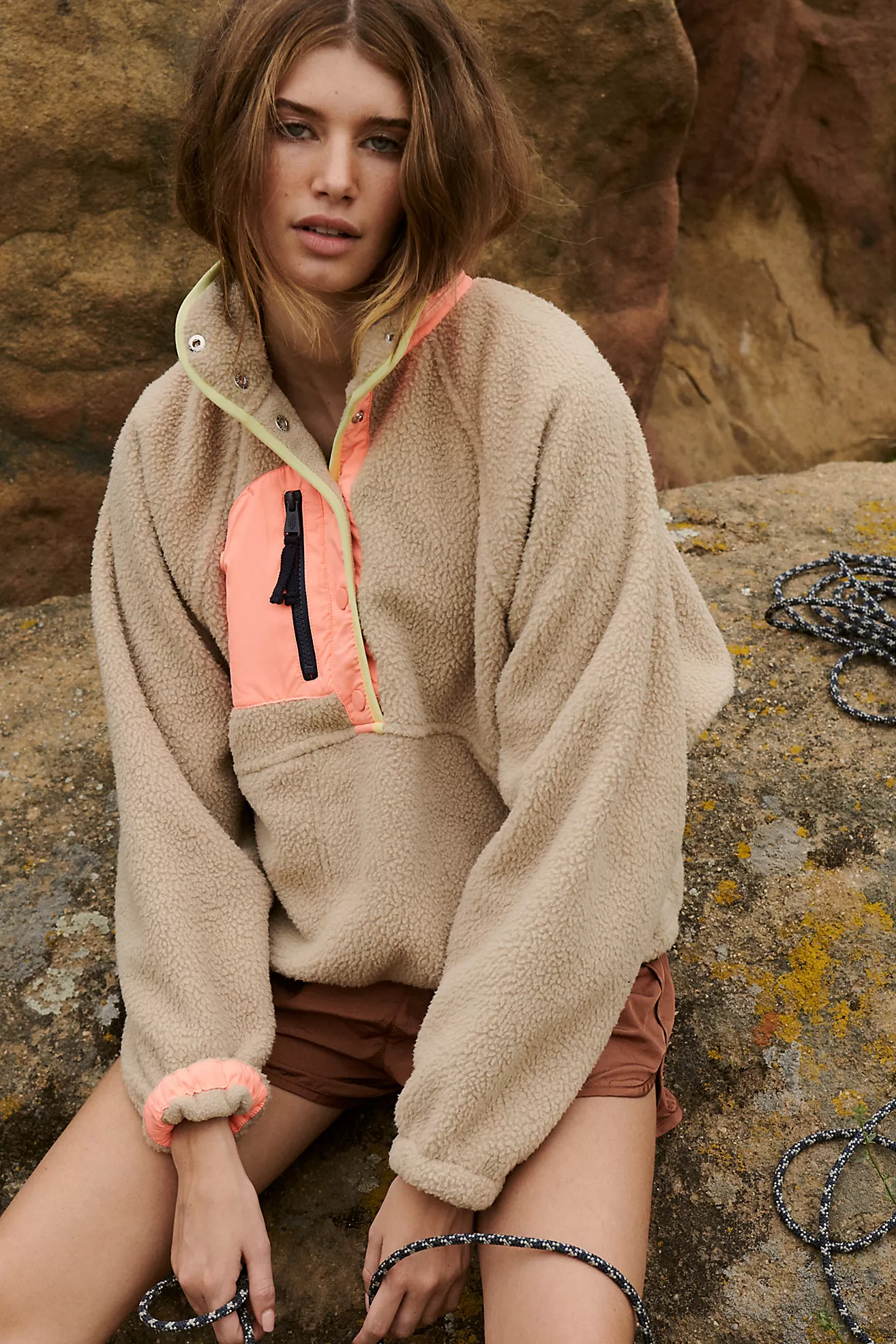Look how perfect those chocolate brown shorts look with that fleece? Make them leggings and this look is almost complete. I like the cheaper chocolate sneakers, but you could also do a beige pair like these instead.
